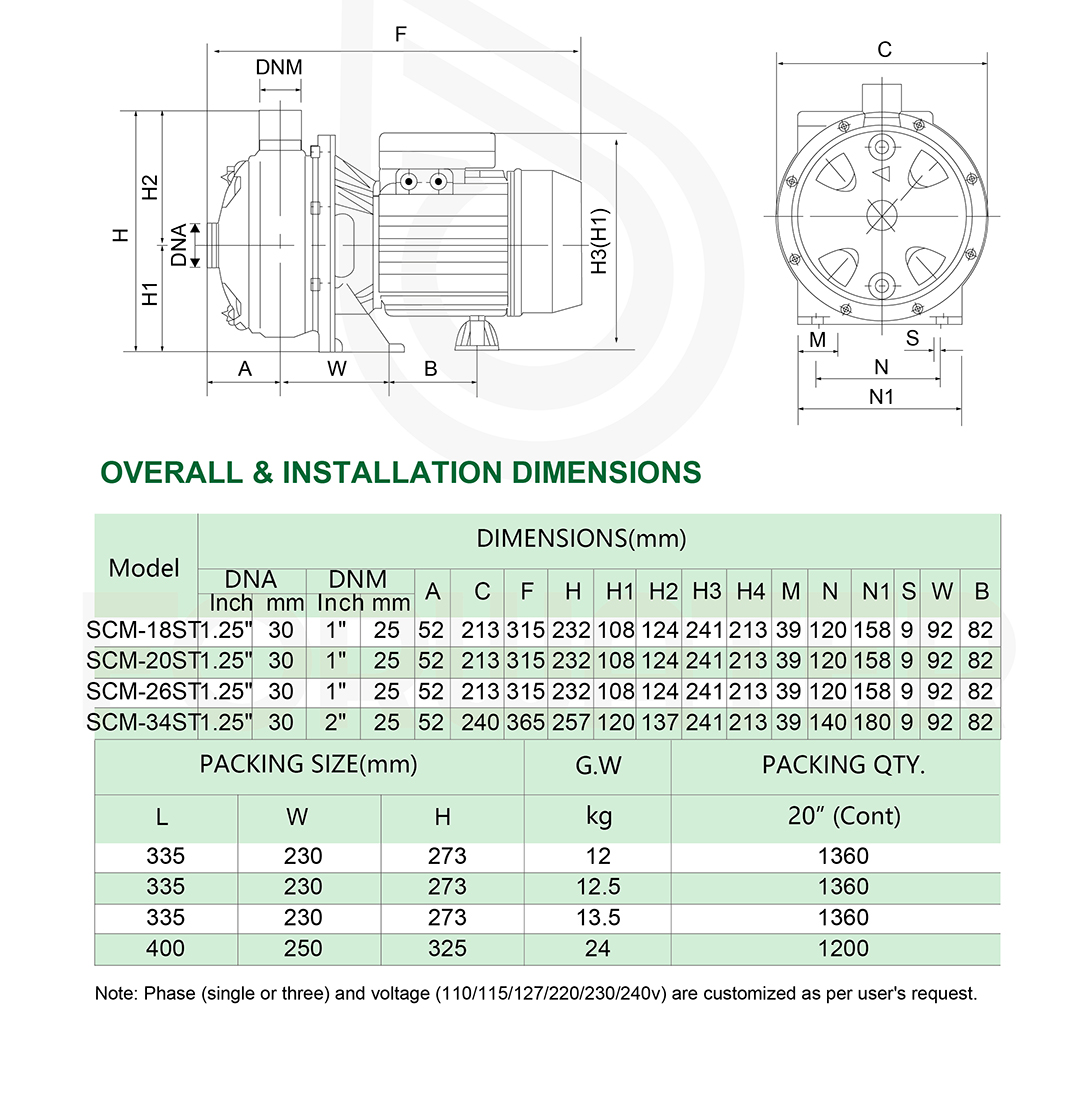 SCM-ST series are single stage centrifugal pump, can be used to transfer clean water or other similar water in physical and chemical properties. It is suitable for industrial use and urban water supply, pressure boosting for high buildings and fire system, garden irrigation, long-distance water transfer, heating ventilation and air controlling, circulation and pressure boosting for cold and hot water, and supporting equipment, etc. SCM-ST series stainless steel centrifugal water pump is your best choice. This high-quality pump combines durable materials of construction with impressive performance to give you the ideal solution for a variety of applications.