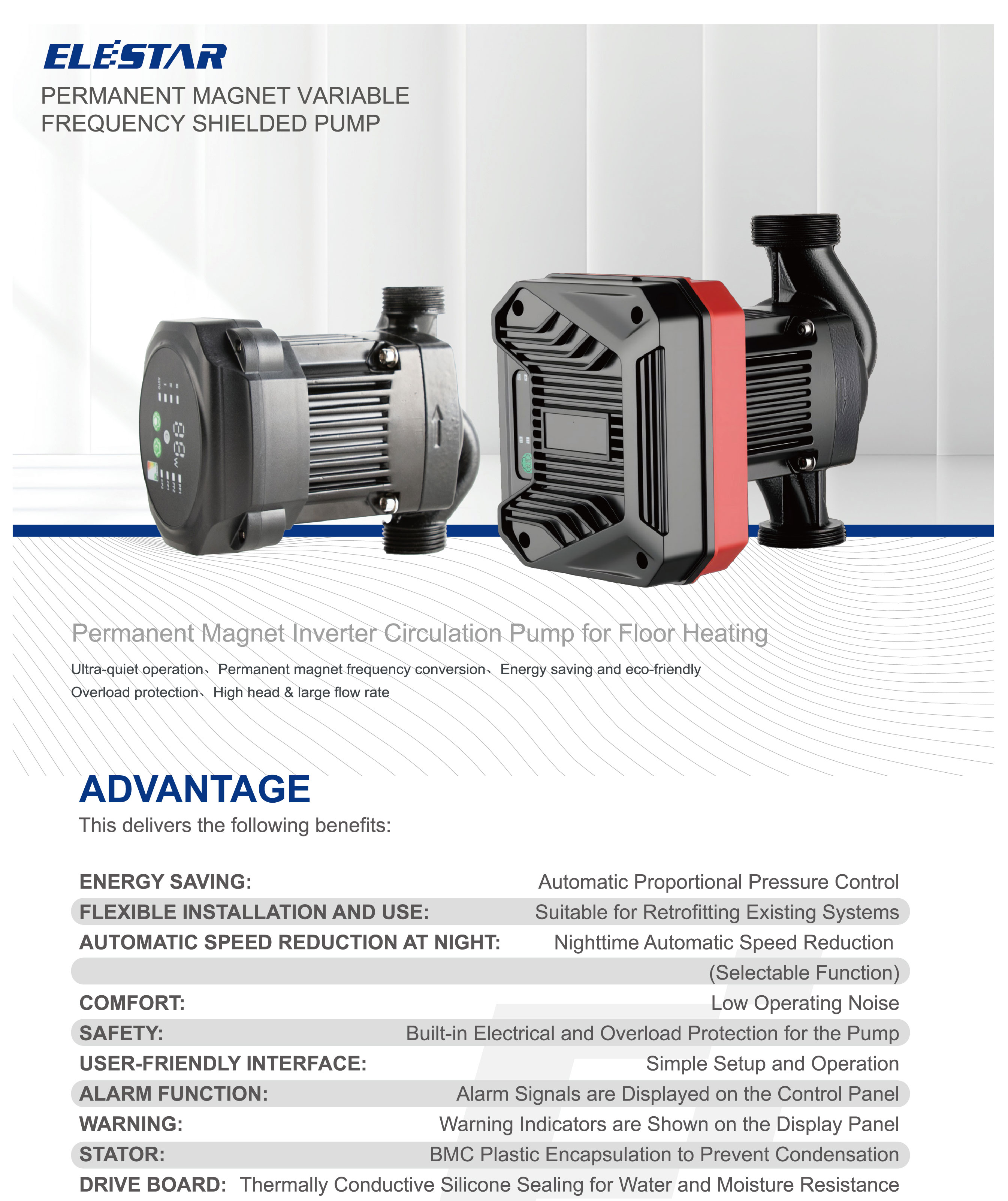 Performance: Ultra-quiet, energy-saving, high head & flow rate; permanent magnet frequency conversion.
