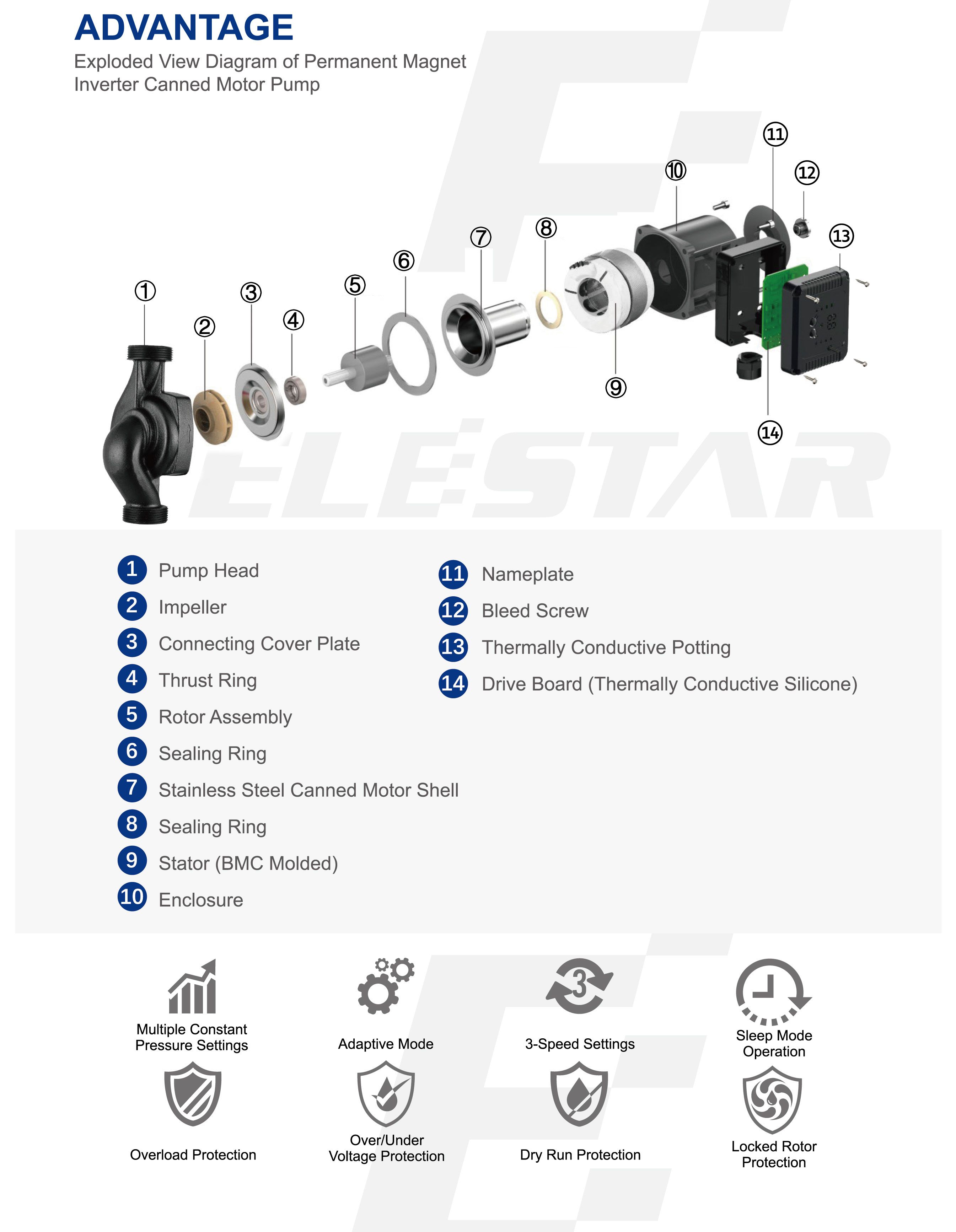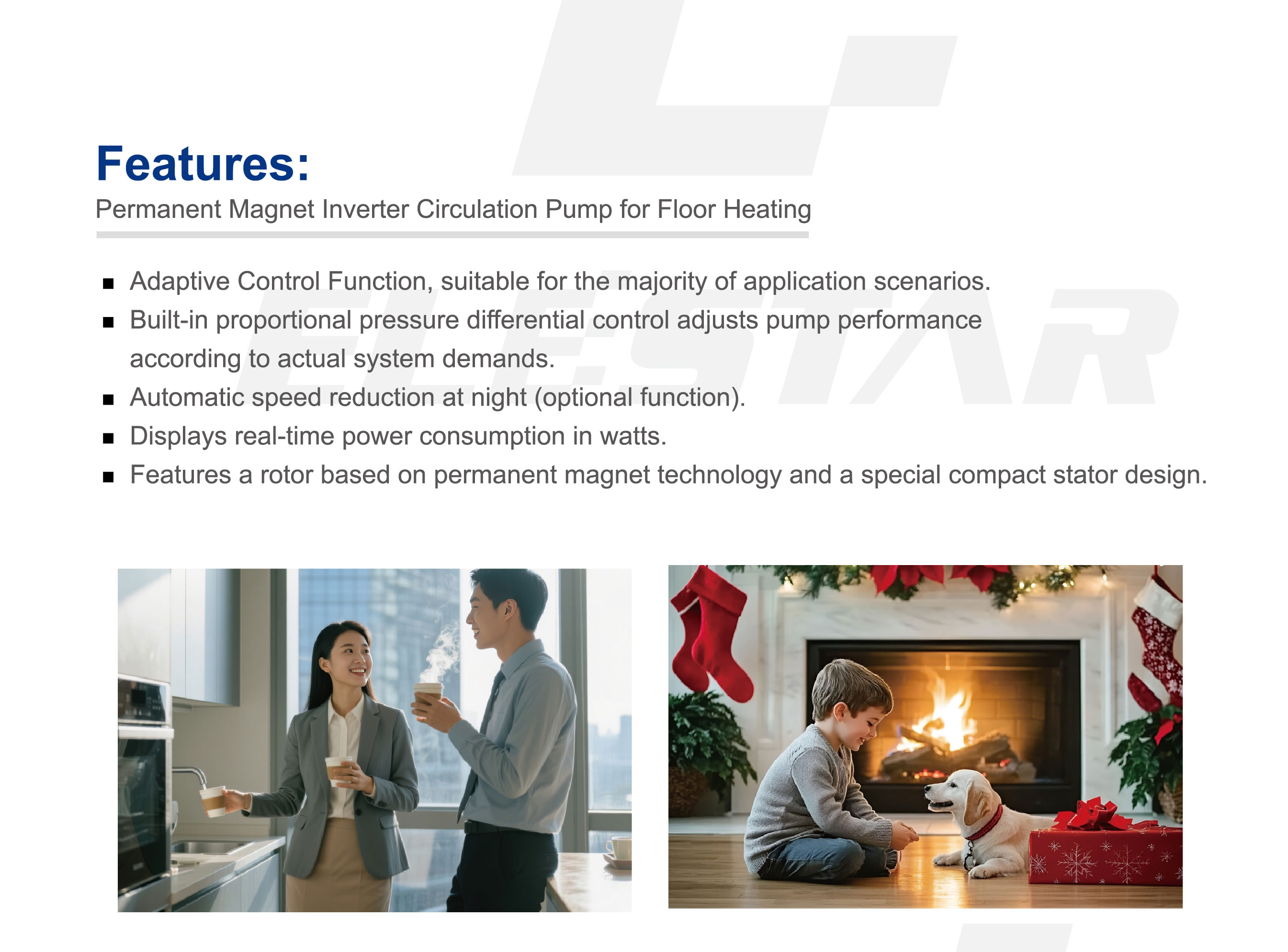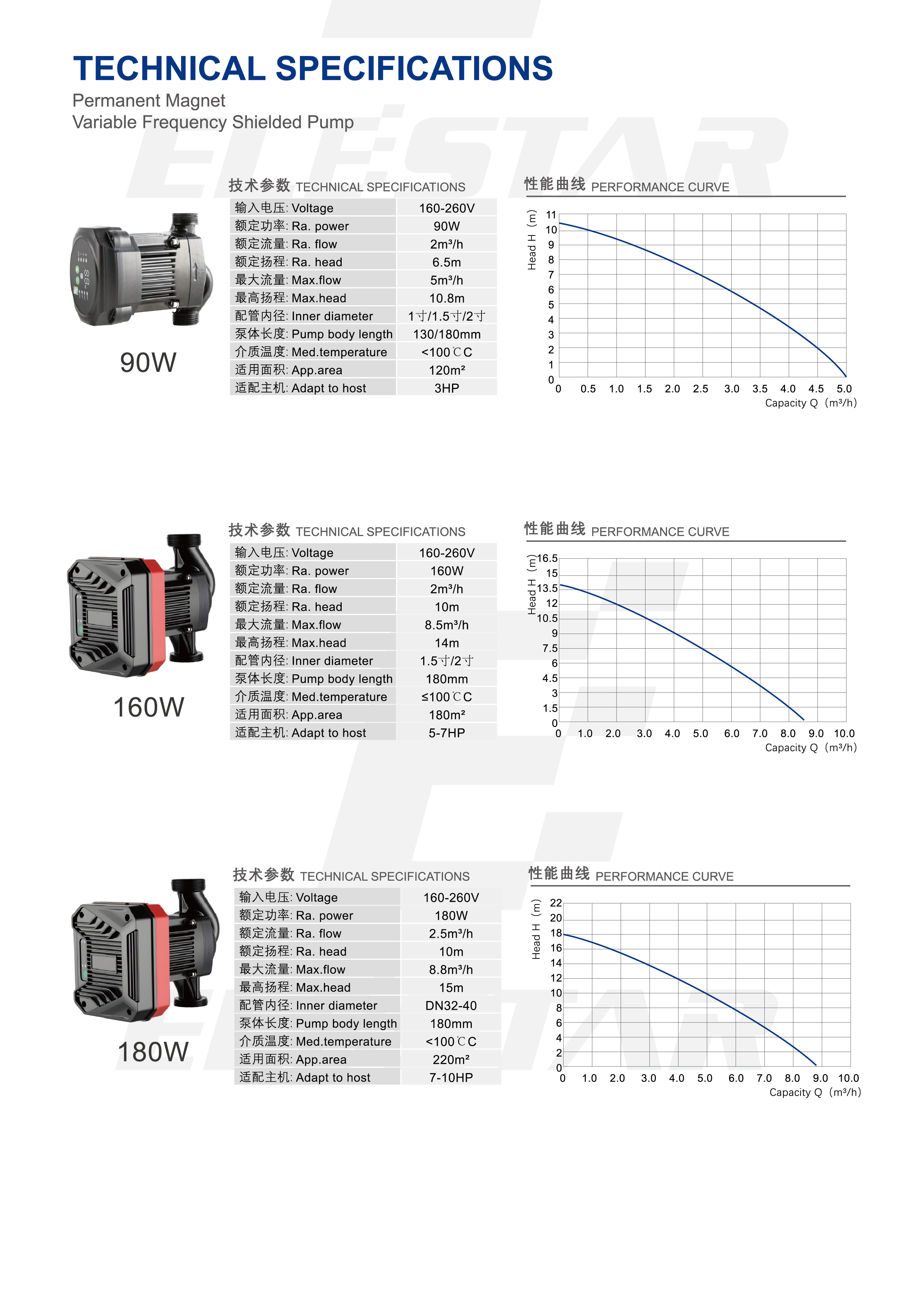 Performance: Ultra-quiet, energy-saving, high head & flow rate; permanent magnet frequency conversion.